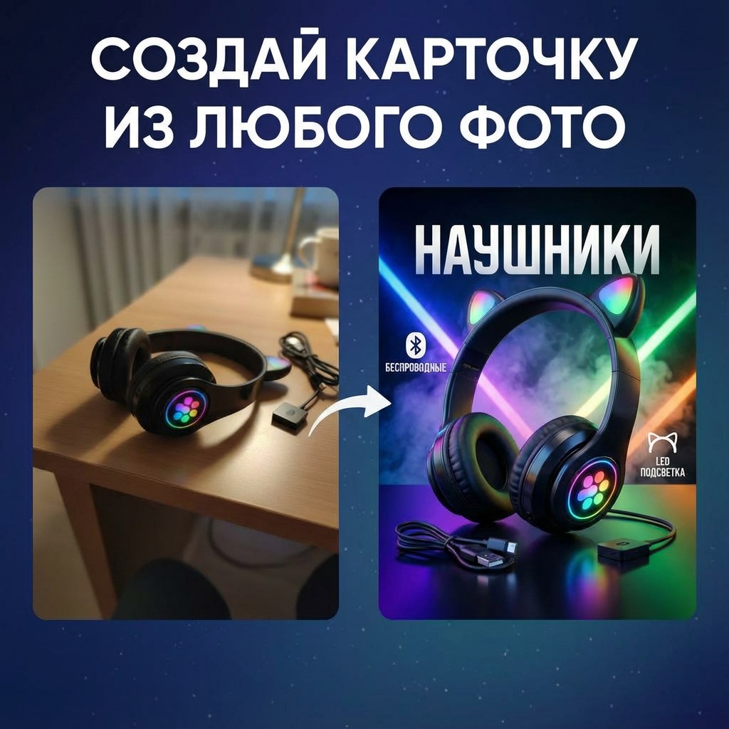 Upload a product photo — AI will create a professional card with a beautiful background and infographics. Or upload an existing card — AI will redesign it: fonts, layout, and style.